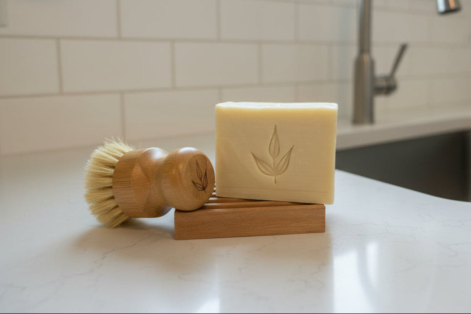 To use: Pair with an eco-friendly brush or scrubby to apply to your dishes (we love sisal scrubbies!). Re-lather as needed. Be sure to use a slotted soap dish, this will make the soap last longer and not get soft.